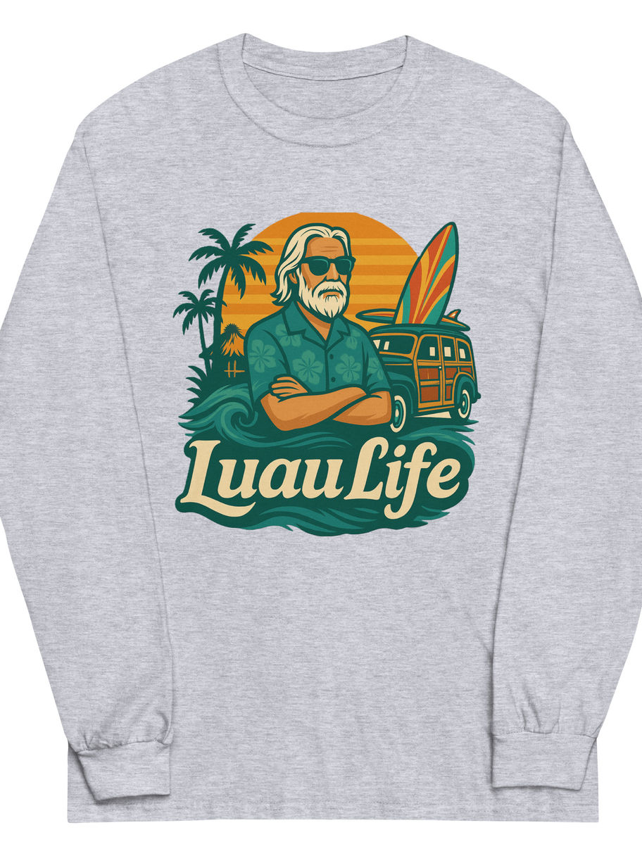 This bold LuauLife design channels the laid-back soul of the original surf culture. Featuring a legendary silver-haired surfer in shades, a vintage woody wagon, and a stylized wave scene framed by tropical palms and a retro sunset, it captures the essence of island cool. With a nod to the old-school riders who shaped the surf scene, this graphic is perfect for those who know that true style never fades. Whether on a tee or a mug, it’s a tribute to timeless vibes and the classic cruiser spirit of the Luau Life.