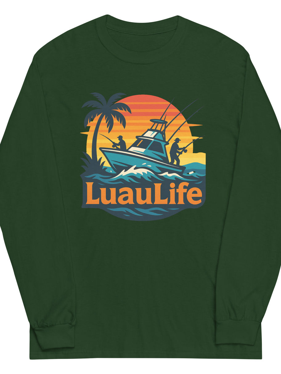 Hooked on the Luau Life captures the thrill of deep sea fishing wrapped in a tropical dream. This bold, vibrant design features two anglers casting off a sleek fishing boat under a fiery sunset, surrounded by crashing waves and swaying palms. It’s a celebration of saltwater adventure, island vibes, and living life off the dock. Perfect for anyone who finds peace with a rod in hand and ocean breeze in the air, this artwork brings the spirit of the sea to life—Luau style. Great for tees, stickers, and gear that say you're always ready to cast off.