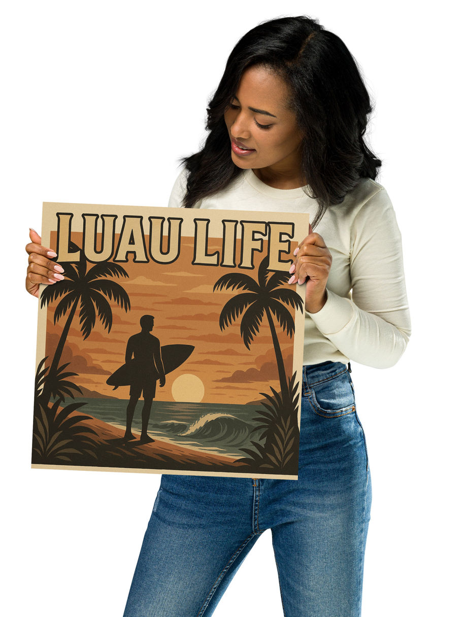 Capture the essence of coastal freedom with Sunset Sentinel – Embrace the Luau Life. This bold tropical print features a lone surfer silhouetted against a stunning sunset, framed by swaying palms and crashing waves. Perfect for any beach lover or surf enthusiast, the artwork brings island vibes and tranquil strength to any space. With its rich, vintage-inspired colors and clean vector style, it’s a timeless tribute to the spirit of the Luau Life. Ideal for beach homes, surf shacks, or anyone dreaming of their next escape to the shore. Let this print bring paradise to your walls.