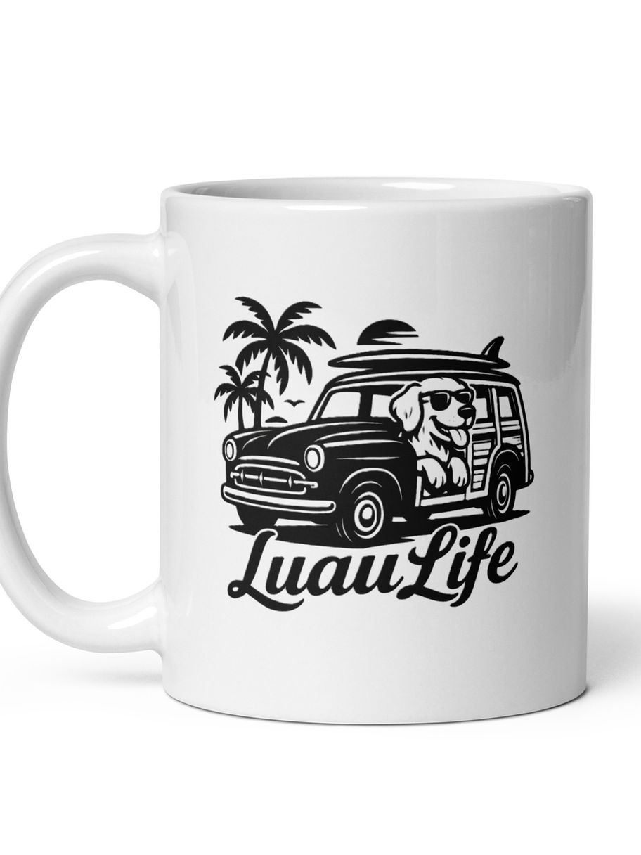 This playful black-on-black LuauLife logo features a classic surf wagon with a happy dog wearing sunglasses hanging out the window. Palm trees, birds, and a surfboard on the roof complete the vintage beach scene, capturing the carefree spirit of island adventures. The retro script “LuauLife” ties the design together, making it perfect for apparel, decals, or merch celebrating the laid-back surf lifestyle with a tropical twist.